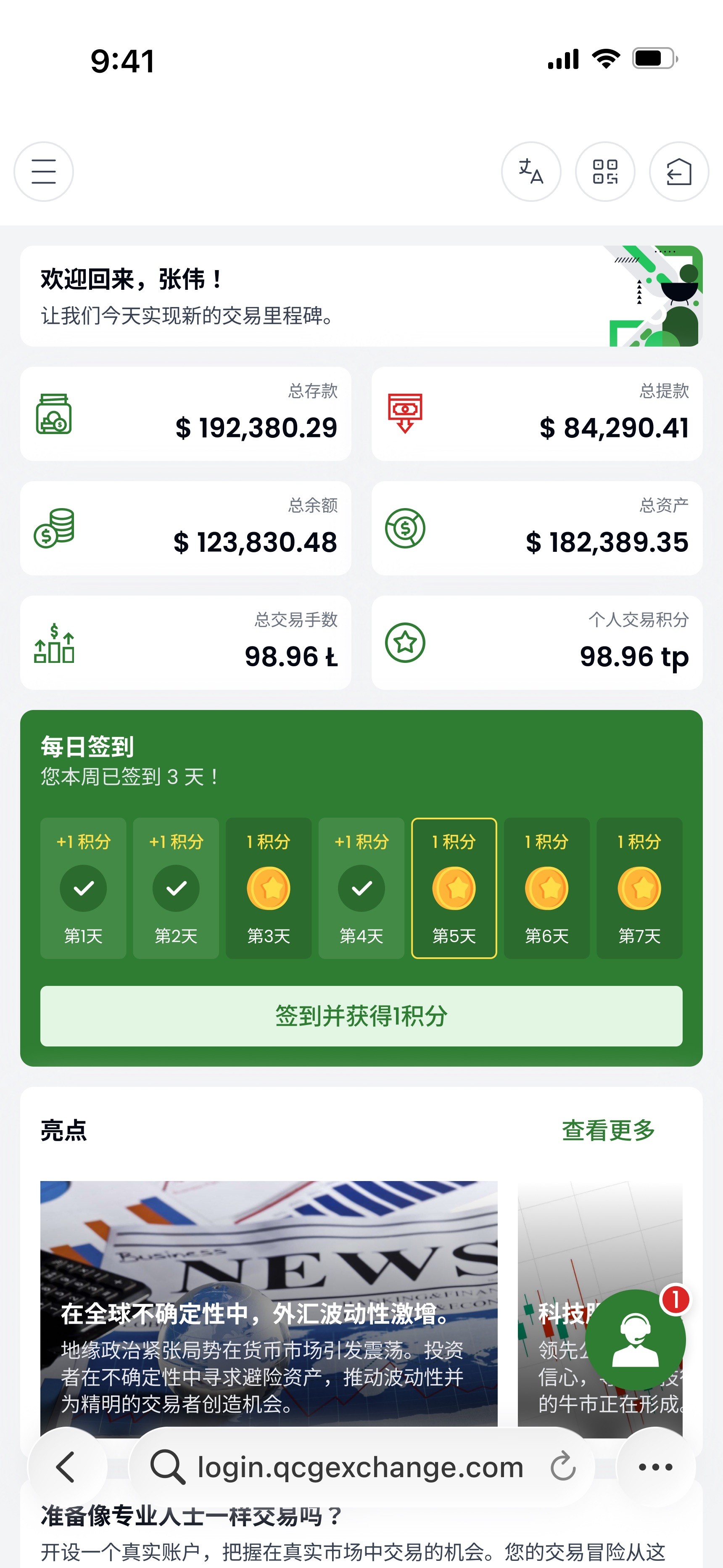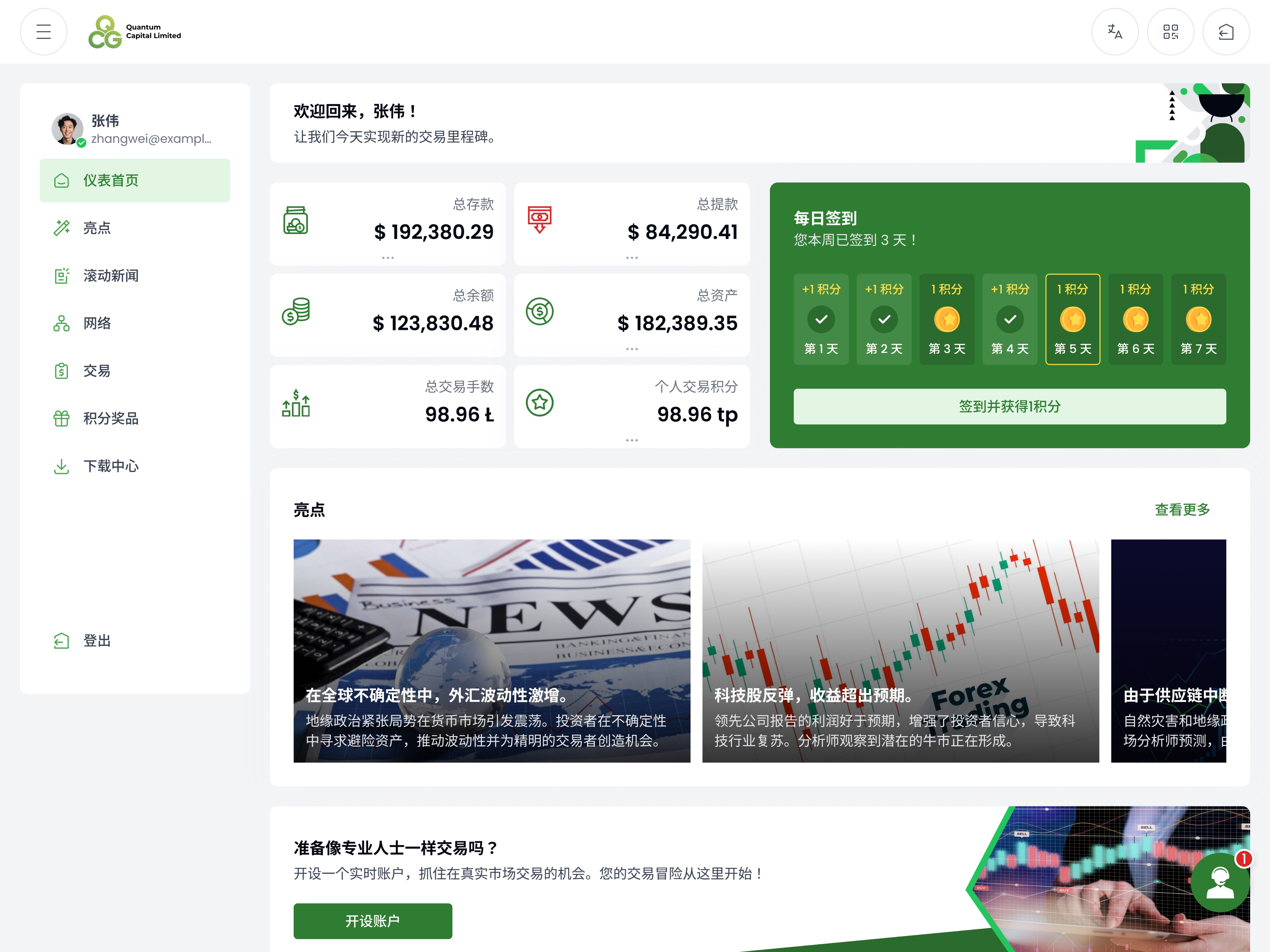 体验 QCG 创新交易平台的完整实力:真实市场行情、低点差与高速成交。每一笔交易都可累积宝贵的交易积分,可兑换丰富奖励与专属权益。